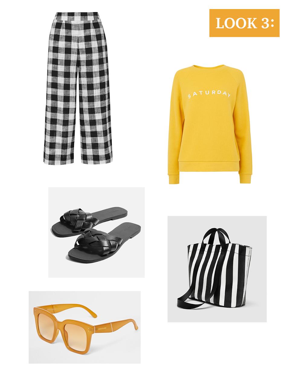 This Zara Striped Tote (£19.99) would make for a perfect pattern clash with the gingham of the trousers, and match your sunnies to your sweatshirt… something like these River Island Yellow Square Oversized sunnies (£16) might work.